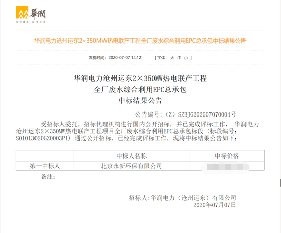 河北省廊坊市廊坊经济技术开发区2020年6月,北京永新环保有限公司经过9家角逐,成功中标华润电力沧州运东2×350MW热电联产工程全厂废水综合利用EPC总承包项目.